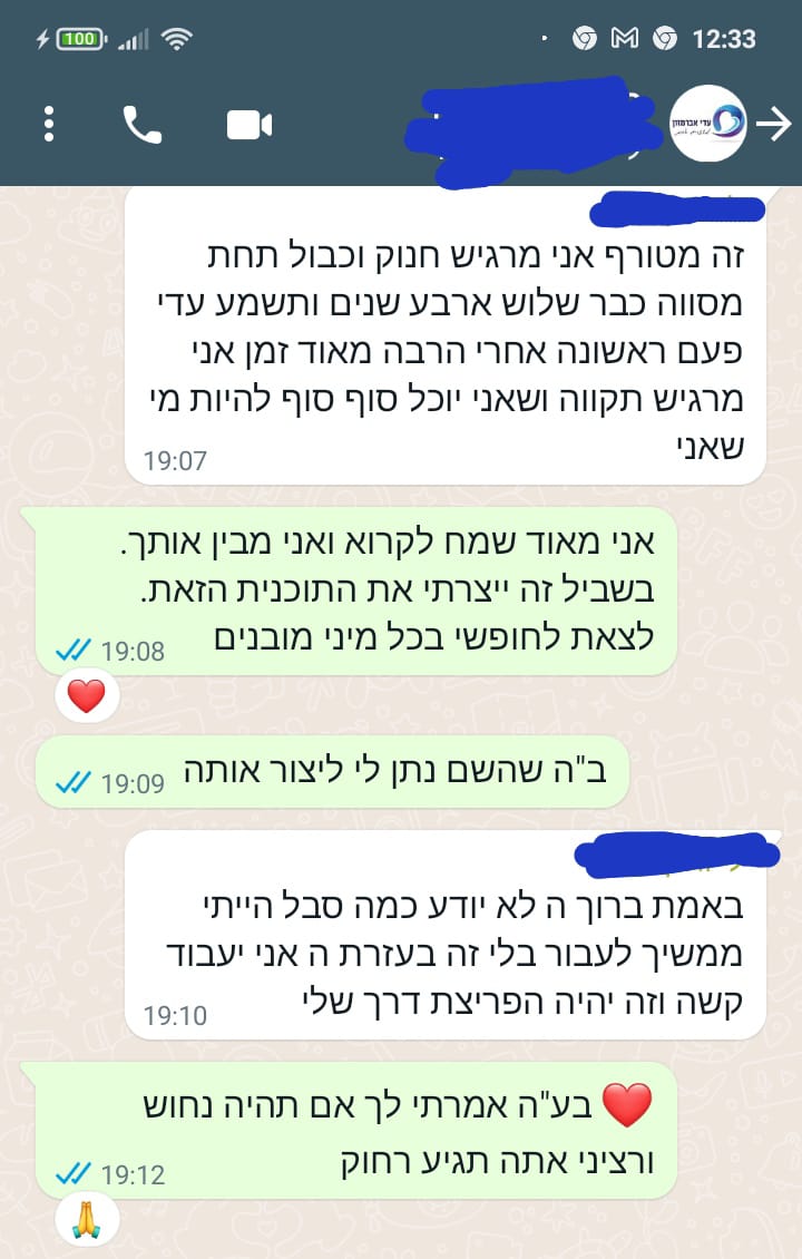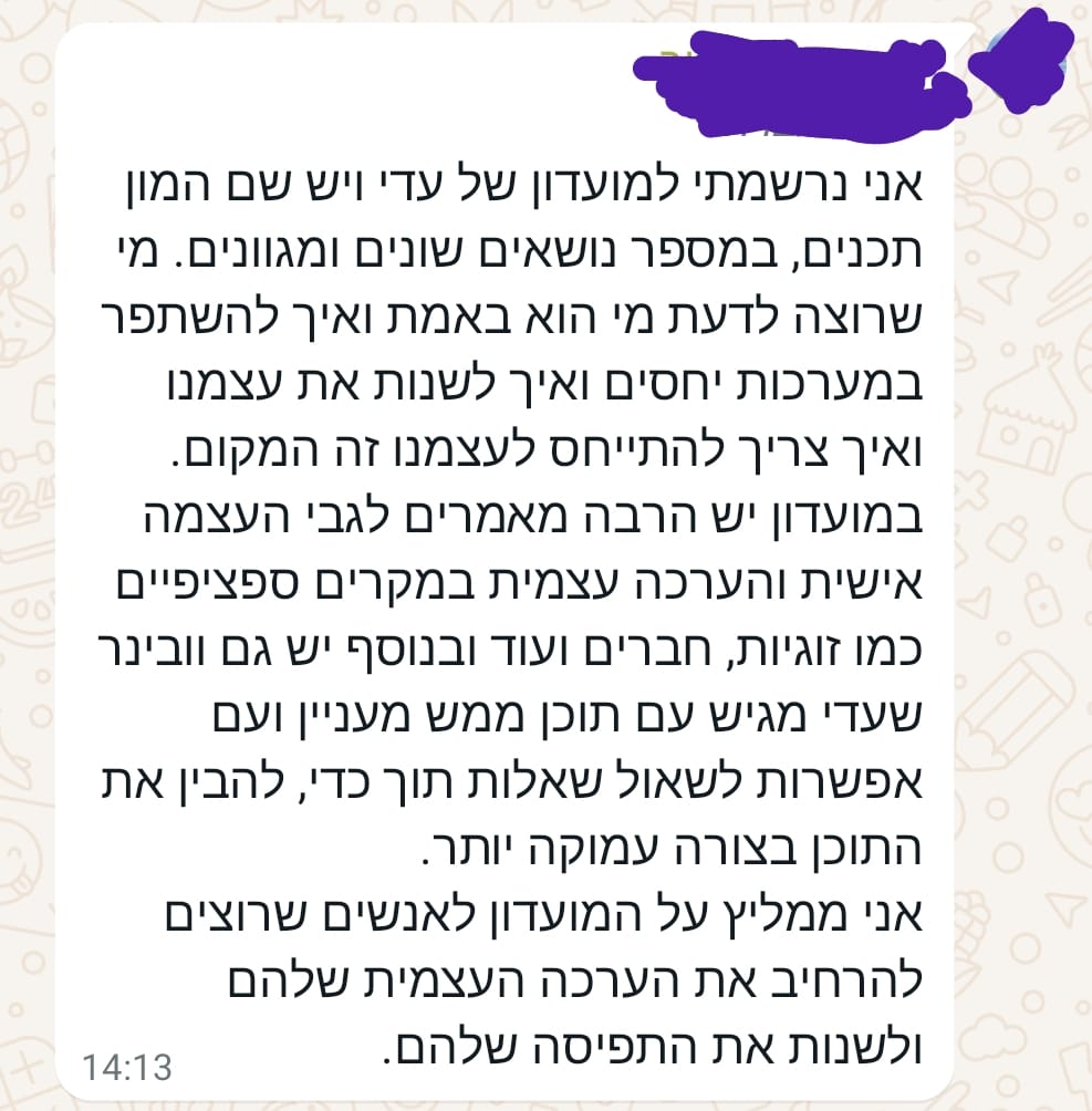 קבוצת וואטסאפ שבה אני שולח 2 – 3 מאמרים בשבוע, ועם אפשרות לשאול אותי שאלות באופן אנונימי.